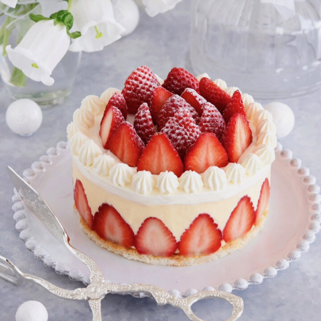 スポンジ(ジェノワーズ)生地の作り方、ムースリーヌクリームの作り方、組み立て方、シロップ、絞り出し袋の使い方、デコレーション方法etc.