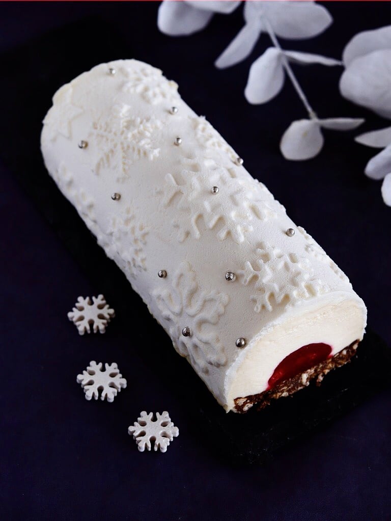 カットした時の断面がとっても魅力的なケーキ。表面は雪の結晶の模様に仕上げてまさにホワイ